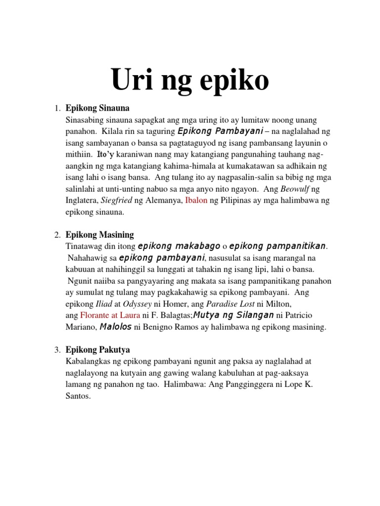 Ano Nga Ba Ang Imperyalismo. Lagda Bisaya Haraya Bisaya Maragtas Bisaya Kumintang Tagalog Biag ni Lam-ang Iloko 10. Ano ang Epiko Ang epiko epic ay mula sa salitang Griyego na may kahulugan na salawikain ay isang uri ng panitikan o kwento sa pamamagitan ng tulang pasalaysay na patungkol sa kabayanihan pakikipagsapalaran at pakikipagtunggali ng isa o grupo ng pangunahing tauhan laban sa mga kalabang masasama ang loobIto ay pinagbibidahan ng.