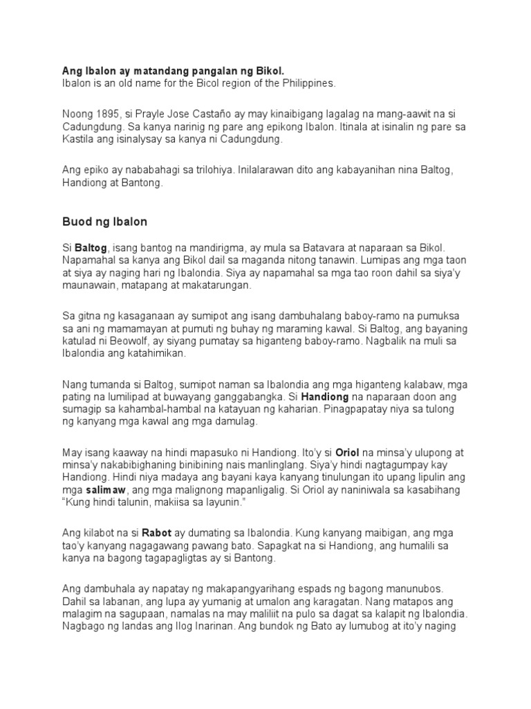 Ibalon Buod ng Ibalon Epiko ng Bicol Si Baltog ay nakarating sa lupain ng Ibalon dahil sa pagtugis niya sa isang malaking baboy-ramo. Ibalon is an old name for the Bicol region of the Philippines. Mayaman ang lupain ng Ibalon at doon na siya nanirahan.